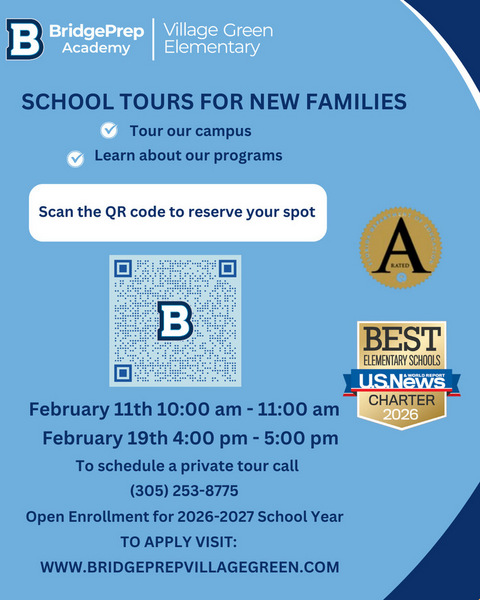 Come and see all BridgePrep Academy of Village Green Elementary Campus has to offer. Enrollment is open for students in grades K-5. Our school is small, safe, quaint and has a personal environment. We offer before and after care, a dual language program, a positive behavior system, and much more. Scan the QRcode to reserve your spot ⭐ or follow this link.